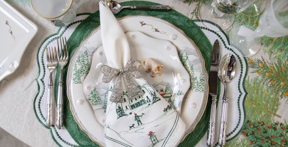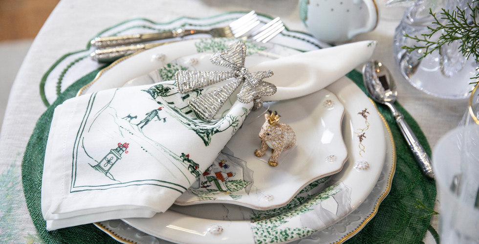 Juliska Country Estate napkins in evergreen are pretty, seasonal and add a little hint of red to the place setting. Additionally, an eye-catching napkin ring stands out and draws the eye to the center of each place setting. “A little bit of sparkle on a table is nice,” Reed said.